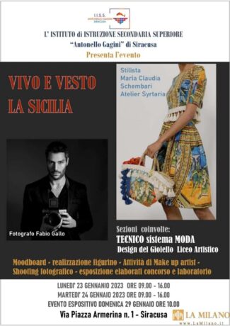 Siracusa, un’attività per mettere alla prova giovani designer. L’I.I.S.S. “Antonello Gagini” di Siracusa annuncia l’organizzazione dell’evento VIVO E VESTO LA SICILIA che vedrà la partecipazione degli studenti della sezione Tecnico Sistema Moda e Design del Gioiello Liceo Artistico. Nei giorni 23 e 24 gennaio, presso la sede di Via Piazza Armerina n.1, si svolgeranno […]